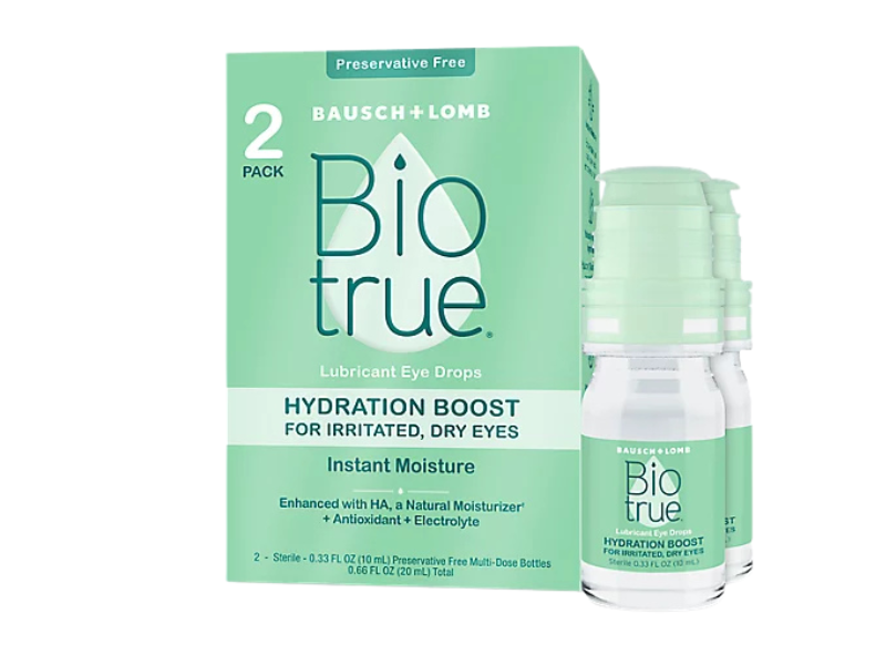 Biotrue Hydration Boost Eye Drops are preservative free drops that provide instant moisture to eyes that are dry and irritated from screen and environmental stressors.